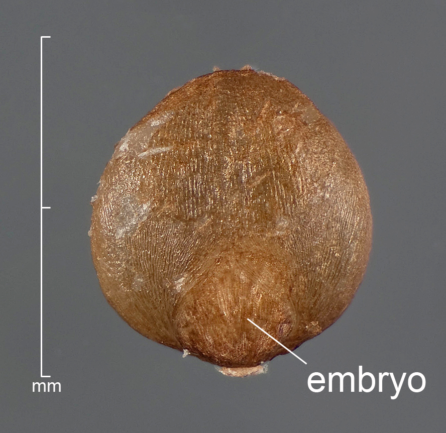 Caryopsis broadly ovate to round, dorsally compressed, 1.5–2.3 mm long x 1.5–2.3 mm wide, brown, embryo 0.35 length of caryopsis, hilum oval, dark.