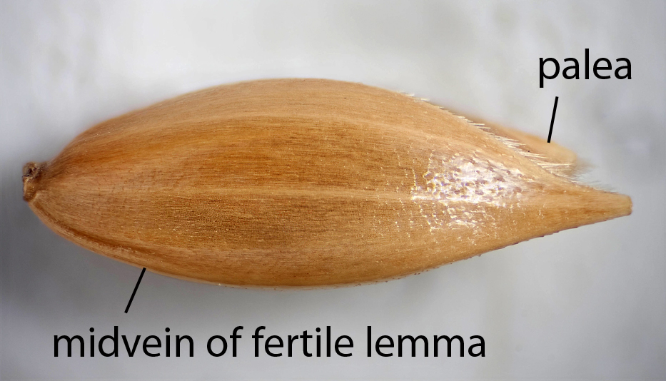 Fertile lemma elliptic, laterally compressed, 4.5–6.8 mm long, cartilaginous, shiny, straw-colored, keeled, 5-veined, surface pubescent, apex acute.