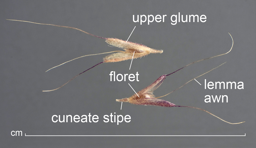 Spikelets solitary, pedicelled (pedicel and/or stipe cuneate, 0.5–1 mm long), cuneate, laterally compressed, 2.5–3 mm long (not including awns), consisting of 1 fertile floret without rachilla extension. Disarticulation occurs below glumes with a small part of the pedicel/stipe attached.