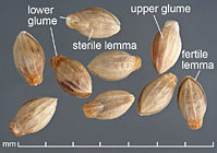 Fertile lemma elliptic, dorsally compressed, convex in profile, 2–3 mm long, light grayish-brown, usually with satiny sheen, indurate, without keel, 3 veins light-colored, surface ridged transversely, margins involute, apex obtuse.