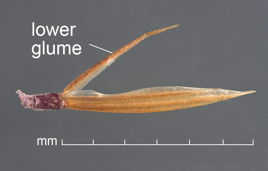Glumes persistent, shorter than spikelet, thinner than lemma, membranous, surface scabrous, glabrous or pubescent, apices attenuate. Lower glume linear, 1.7–5.5 mm long, 0.5–0.75 length of upper glume, keeled, 1-veined, lateral veins absent. Upper glume lanceolate, 3.5–7.5 mm long, 0.75 length of adjacent fertile lemma, without keel, 3–5-veined, lateral veins ribbed.