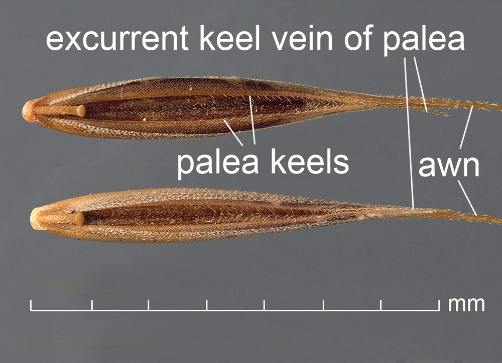 Palea slightly shorter to slightly longer than lemma, 2-veined, apex with excurrent keel veins (2 teeth ca. 0.2–1 mm long).