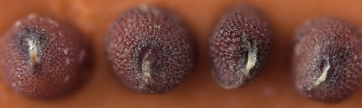 Seed irregularly elliptical (rounded to angular) to ovoid or sub-globose, (1)1.2–1.5(2) mm diameter, often without a distinct ridge or groove representing the position of the radicle. Surface glabrous, dark reddish-brown to black, coarsely reticulated (prominent thick veins with small, deep interspaces), interspaces of mature seeds typically pitted.