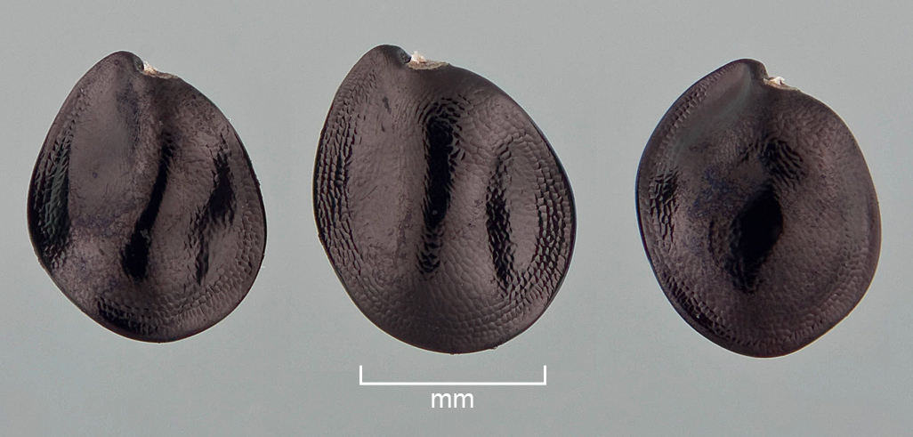 Seed round or elliptic in outline, compressed with an acute, broadly wavy (saddle-shaped) marginal rim and a curved lenticular cross-section, with a protruding notch along the margin where hilum occurs, 1–2.5 mm diameter x 0.6–0.8 mm thick. Surface shiny, ± smooth (under magnification, looking cobblestone-like with fine reticulations and large interspaces), black.