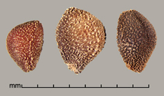 Seed wedge-shaped (sides flat to concave), obovate in outline, slightly dorsiventrally compressed, cross-section trigonous to sector-shaped, (2.5)3–5 mm long x 2–3(3.5) mm wide x 2–3 mm thick. Surface dull, light to dark grayish- or orangish-brown, usually covered with small, rough, irregular and often lighter-colored tubercles.