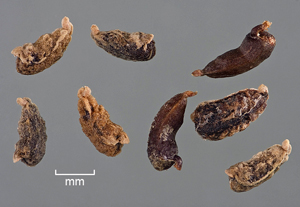 Fruit a cypsela, obcuneate to obovate, curved towards ventral side (dorsally gibbous, sometimes a distinct dorsal longitudinal rib is evident), cross-section ± trigonous, (1.8)2–2.5 mm long x 0.8–1.1 mm wide x 0.8–1.1 mm thick. Surface glabrous, irregularly lumpy (smoother fruits may be undeveloped or aborted), tan to brown to black with various markings, often darker on the dorsal side. Apex beaked, beak offset ventrally, ascending. Pappus none.
