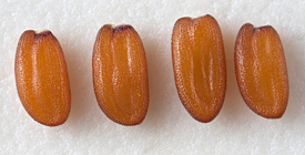 Seed oblong in outline, partially compressed, cross-section bilobed or ovoid to triangular, one face longitudinally convex, the other face flat to transversely convex, 0.7–1.3 mm long x 0.4–0.7 mm wide x 0.3–0.5 mm thick, with a groove on each face tracing an ellipse near the hilar end of the seed outlining the bent positions of the radicle and cotyledons. Surface glabrous, reticulated in a distinct regular ladder-mesh pattern in parallel rows, shiny or oily-looking, golden to bright orangish-brown with a reddish circular marking over the cotyledons at the hilar end of the seed.