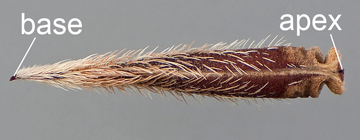 Seed oblanceolate, ± terete, 3–4 mm long x ca. 1.1–1.2 mm wide. Surface tan to brown, with a low ridge radiating upwards from the top of the hilum.
