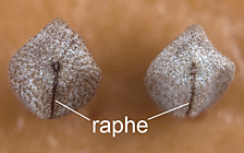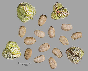 Seed ovoid to oblong in outline, 4-sided, not compressed, truncate at chalazal end, 0.7–1.2 mm long x 0.4–1 mm wide. Surface semiglossy (sparkly under magnification), glabrous, cobblestone-like to minutely pitted (seen under magnification), whitish-gray to light brown, rugulose (typically with rounded transverse wrinkles). Caruncle absent. A prominent seam (raphe) on the ventral side connects the hilum to the chalazal area.