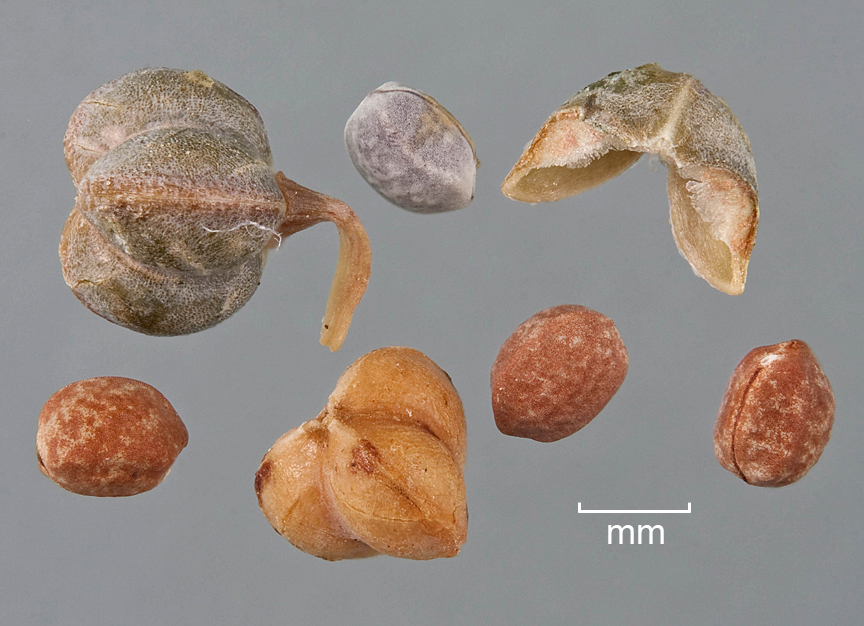 Fruit a capsule, nearly globose, three-lobed, three-chambered (one seed per chamber), 2–2.5 mm long, glabrous or hairy.