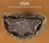 Mericarp flat on adaxial side, convex on abaxial side, 0.7–1.2 mm thick. Abaxial side with five prominent, acute, longitudinal ridges. One oil duct visible per ridge-interval (seen in cross-section). Adaxial side with a central, longitudinal ridge flanked by two less prominent oil tubes. Licorice scented when broken. Seed coat crushed during fruit development.