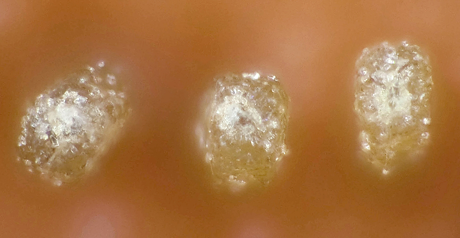 Fruit a cypsela, oblong, plump to somewhat puckered, sometimes slightly dorsally curved base towards apex, mildly compressed, cross-section ± elliptic to oblong to 4-sided, 0.5–0.7 mm long x 0.1–0.3 mm wide x ca. 0.1 mm thick. Surface light brown (darker at the ends), smooth to papillate, glabrous, with a light sheen, rarely with 1+ thin longitudinal ridges. Pappus of whitish bristles, early deciduous, falling separately.