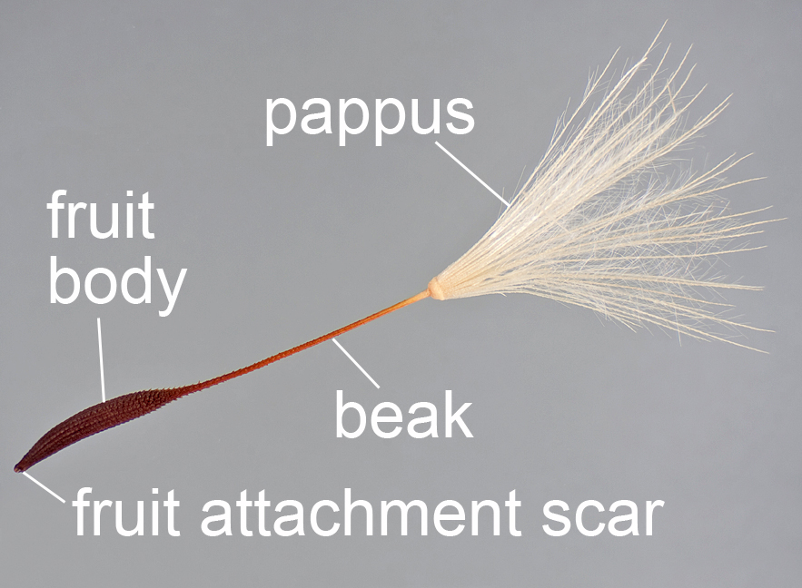Fruit a cypsela. Cypsela body narrowly oblong to fusiform, cross-section terete, 3–5 mm long (without beak) x 0.7–0.9 mm diameter. Surface glabrous, dull, dark brown (sometimes purplish), longitudinally ribbed (ribs 10–12, muricate or scabrid throughout their lengths). Apex beaked (beak slender, 3–9 mm long, grading into the color of the rest of the body). Pappus of whitish to tan bristles in 2 series (the outer barbellate, short, slender, scabrid to plumose, the inner up to 12 mm long, plumose).