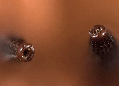 Fruit attachment scar at base, a shiny, mildly segmented, cup-like structure situated at a mildly oblique angle (25–45°).