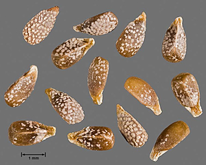 Nutlet narrowly oblong to oblanceolate in outline, apex rounded to truncate, base long-tapered, cross-section triangular to sector-shaped (rounded on dorsal side, ventrally ridged), 1.5–2.2 mm long x 0.9–1.1 mm wide. Surface dull (looking somewhat enameled under maghification), finely reticulated to honeycombed, various shades of brown, with a honeycombed outer layer forming white splotches where thick. Base of nutlet covered with a thick, yellowish, waxy substance (i.e., elaiosome).