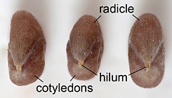Seed ovate-oblong to semi-obovate (with one side straight), compressed, cross-section ± oblong, (1.6)1.8–2.2(2.6) mm long x (1)1.2–1.7 mm wide x 0.3–0.6 mm thick, unwinged. Surface brown with whitish areas, dull, rough (longitudinally striate, obscurely reticulate), with a longitudinal groove outlining the radicle on each side of the seed (a second groove, when present, delineates the individual cotyledons).