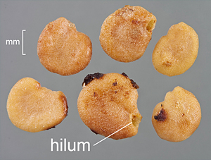Hilum marginal, in notch, typically opening towards one of the flat faces, sunken, ± round (often gaping) to elliptic, 0.2–0.7 mm long.
