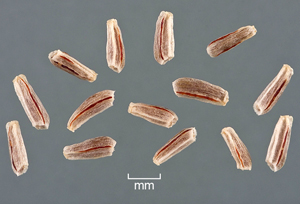 Fruit a cypsela, oblong to oblanceolate, mildly compressed, asymmetrical (abaxially ± gibbous distally), cross-section ± elliptic to 4-sided due to 4 longitudinal ribs, 1–2 mm long x 0.4–0.6 mm wide x 0.3–0.5 mm thick. Surface glabrous, straw-colored to very pale brown or grayish, smooth, with 4 whitish longitudinal ridges (at least 2 of which are typically associated with narrow reddish-brown mucilaginous glands covering over half the length of the fruit). Pappus a short crown to 0.1 mm long x 0.3–0.5 mm across (can be mistakenly interpreted as though there is no pappus).