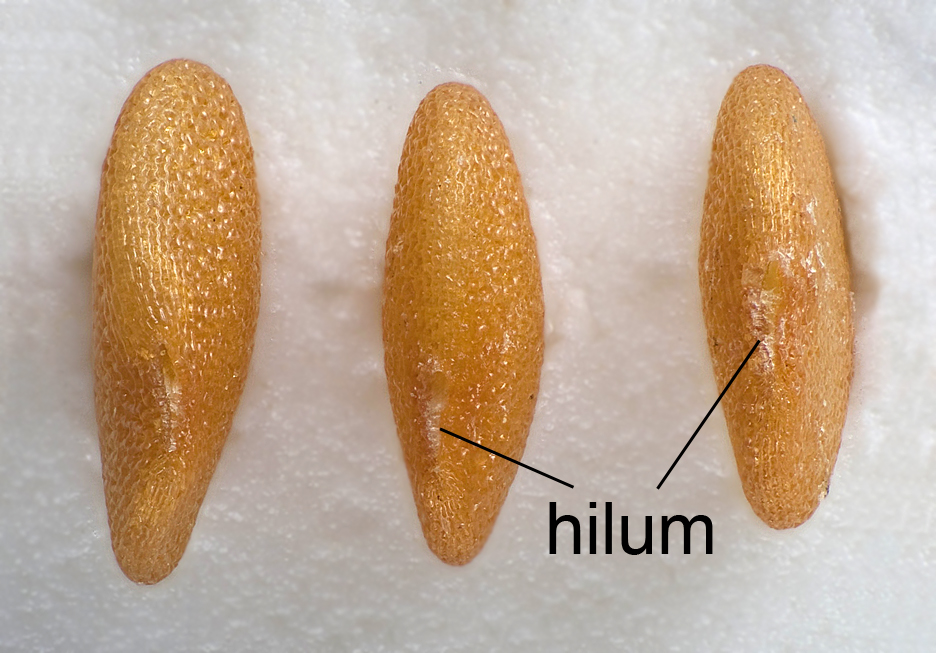 Seed reniform to obovate in outline, typically notched along margin where hilum occurs, strongly compressed, cross-section narrowly elliptic, 1.8–2.4 mm long x 1.6–2 mm wide x 0.4–0.7 mm thick. Surface sparkly (under magnification), a maze of minute undulating ridges, yellowish to light brown (slightly darker near hilum).