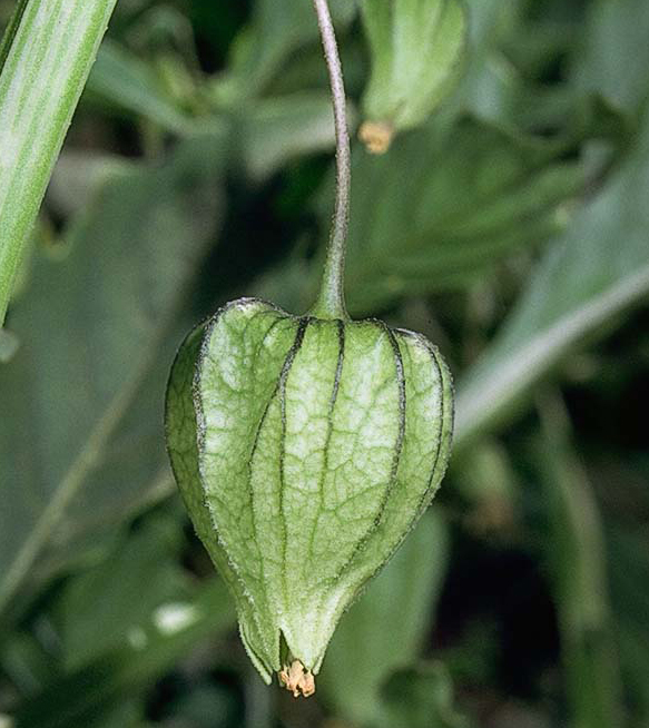 Disseminule a yellowish to orange or purple berry enclosed in a papery husk (enlarged calyx) with numerous seeds. Husk loose, ovoid to globose, 20–25 mm long, green with 10 darker, ribbed, ± equal veins.