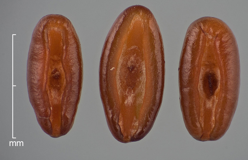 Seed oblong in outline, somewhat compressed, cross-section C-shaped, rounded on dorsal face, longitudinally channeled with involute margins on ventral face, 2–3 mm long x 0.8–1.2 mm wide x 0.4–0.8 mm thick. Surface shiny, smooth (appearing shallowly wavy and minutely granular under magnification), medium to dark brown with a pale brown stripe on dorsal side.