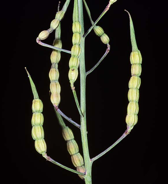 Fruit a multi-(commonly 4–8)seeded, partially dehiscent silique, cylindrical or narrowly lanceolate, ± terete, strongly constricted between seeds at maturity, longitudinally grooved, (2)4–8 cm long x (2)3–8(11) mm wide including the apical beak (=terminal segment) which is 10–20 mm long. At maturity, the fruit breaks apart transversely into short-cylindrical, woody, single-seeded segments measuring ca. 4–7 mm long x 3–8 mm diameter. These segments typically retain the seed and constitute the disseminule.