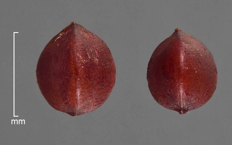 Fruit an achene, broadly ovoid with ± acute (but not accuminate) apex, trigonous with rounded margins, 0.9–1.5(1.6) mm long x 0.6–1 mm wide. Surface reddish-brown, shiny, smooth.