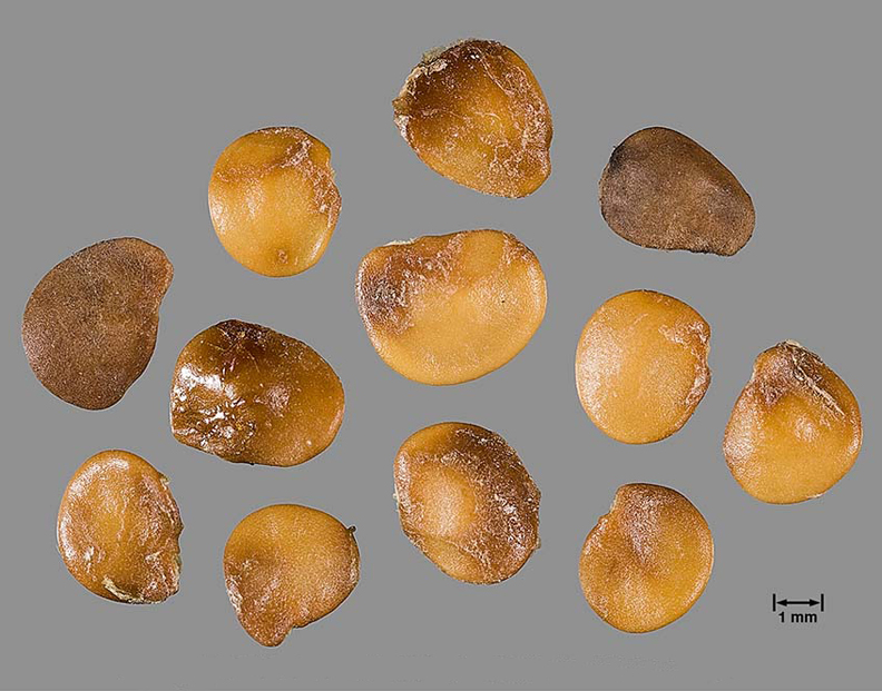 Seed ± obovate to irregularly shaped in outline, typically notched along margin where hilum occurs, strongly compressed, cross-section narrowly elliptic (sometimes curved or C-shaped), 2.5–3.5 mm long x (1.8)2.5–3 mm wide x 0.6–1 mm thick. Surface shiny, smooth (minutely granular under magnification), light yellowish-brown to dark brown.