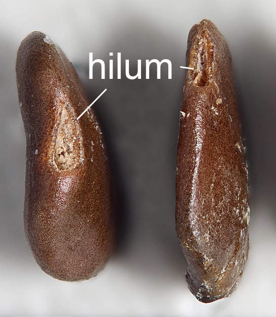 Hilum marginal, in notch, narrowly elliptic to ovate, ± sunken especially at the larger end of the scar, whitish or same color as testa, 0.5–0.9 mm long x 0.2 mm wide.