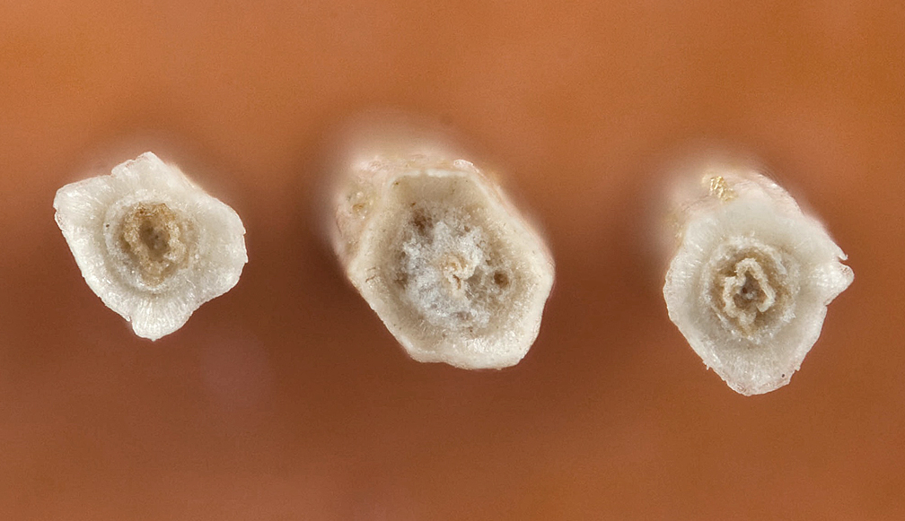 Style base lobed, yellowish, surrounded by a raised, whitish ring, apical scar (including crown) 0.4–0.5 mm across.