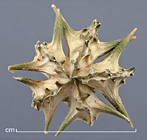 Fruit a woody, spiny schizocarp consisting of (4)5 segments (mericarps, sometimes referred to as nutlets) that separate at maturity. Intact fruit is 5-lobed, 5-angled, ca. 5–10(15) mm diameter, subglobose, greenish-gray to yellowish tan, hairy. Each segment contains 2–5 seeds and is indehiscent.