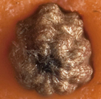Seed oblong to trapezoidal or rectangular in outline, widest at the truncate apex and gradually tapered to a broad but usually slightly rounded base, cross-section terete, 0.6–1 mm long x 0.4–0.6 mm diameter. Surface brown with darker reticulations on top of wavy longitudinal grooves and ribs.