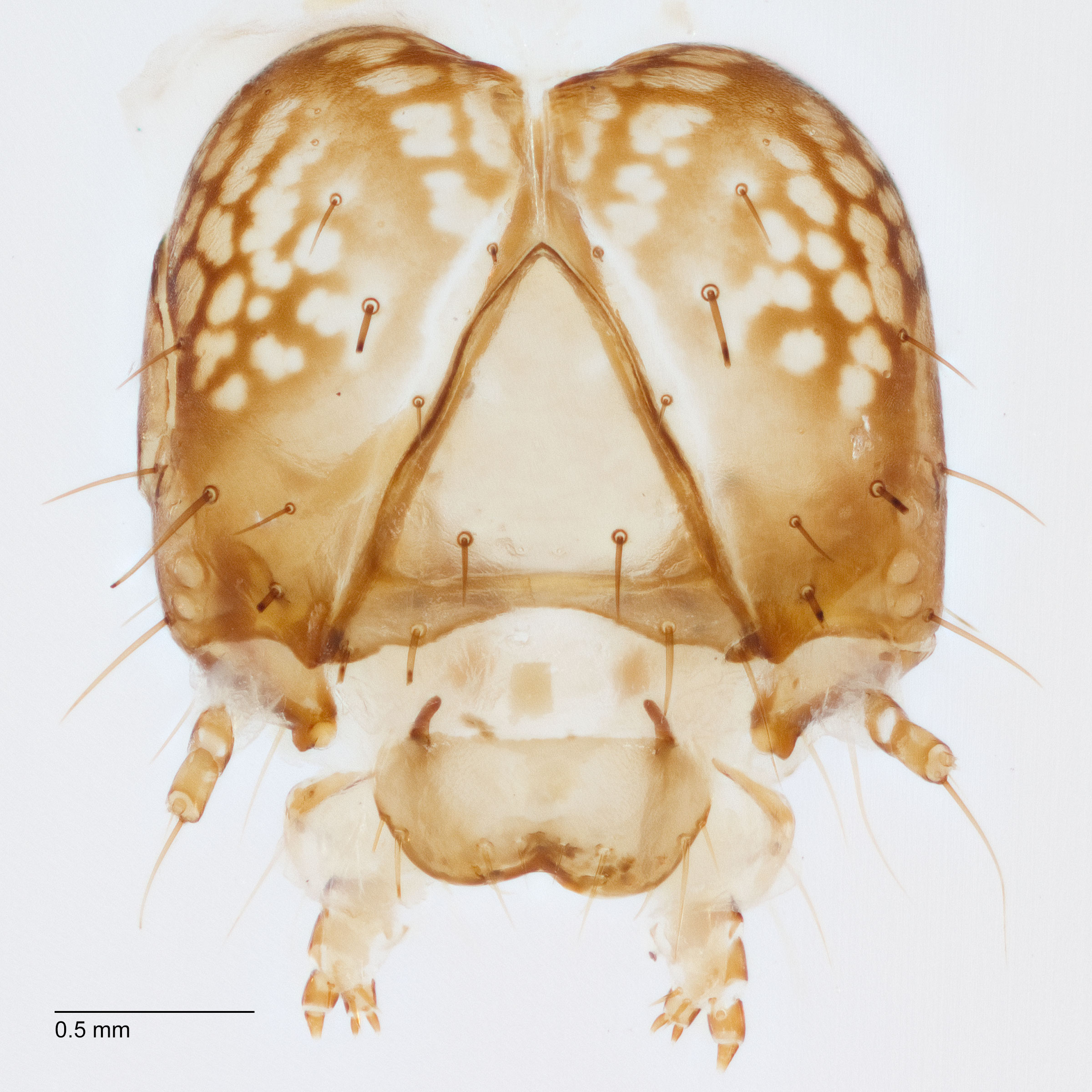 Dong, N., T. C. Carlysle, H. L. Cromroy and D. H. Habeck. 1980. Morphological studies on the beet armyworm, Spodoptera exigua (Hubner) (Lepidoptera: Noctuidae). University of Florida Agricultural Experimental Station Bulletin 816. 38 pp. photographed the head and thorax of the first instarinstar:
