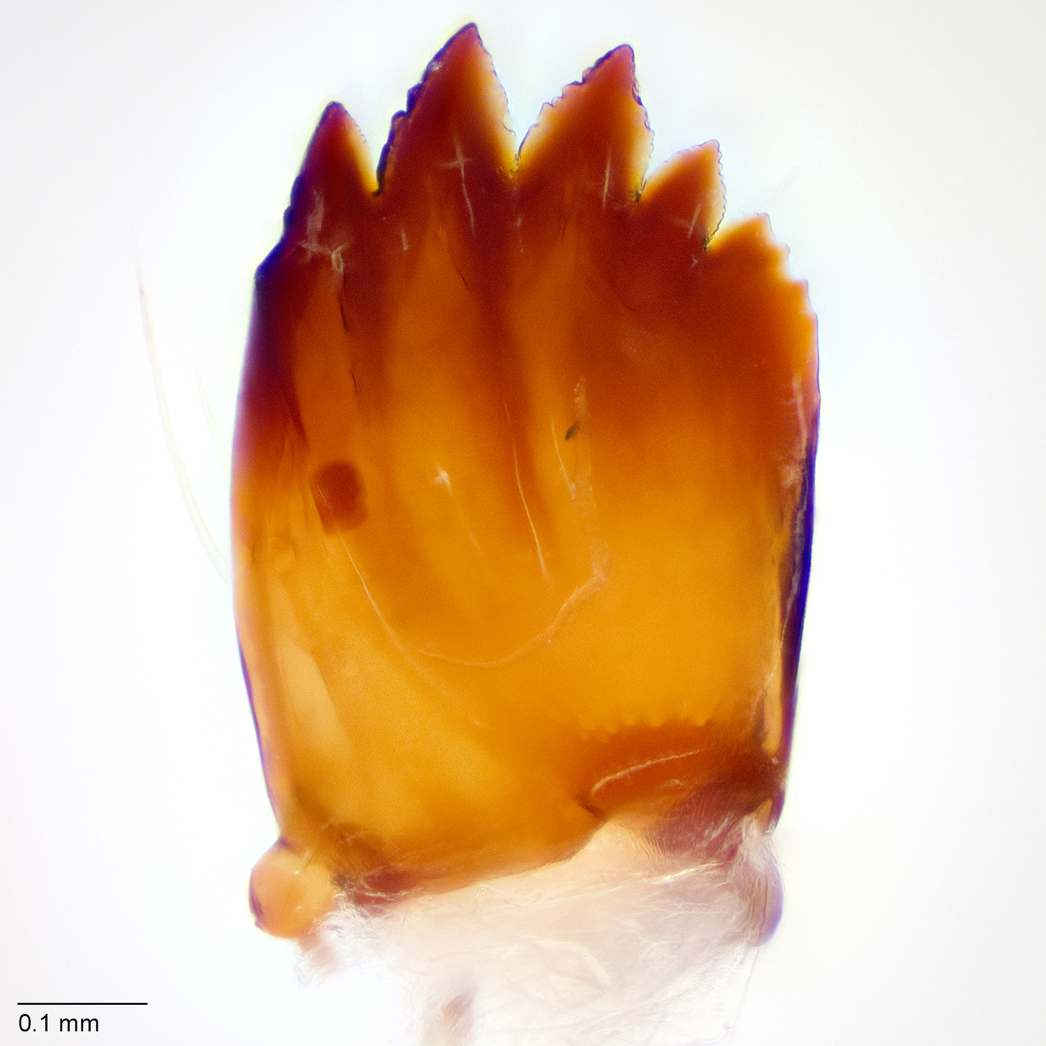 Passoa, S. 1991. Color identification of economically important Spodoptera larvae in Honduras. Insecta Mundi 5(3-4): 185-196.). The mandible has no inner teeth or retinaculumretinaculum: