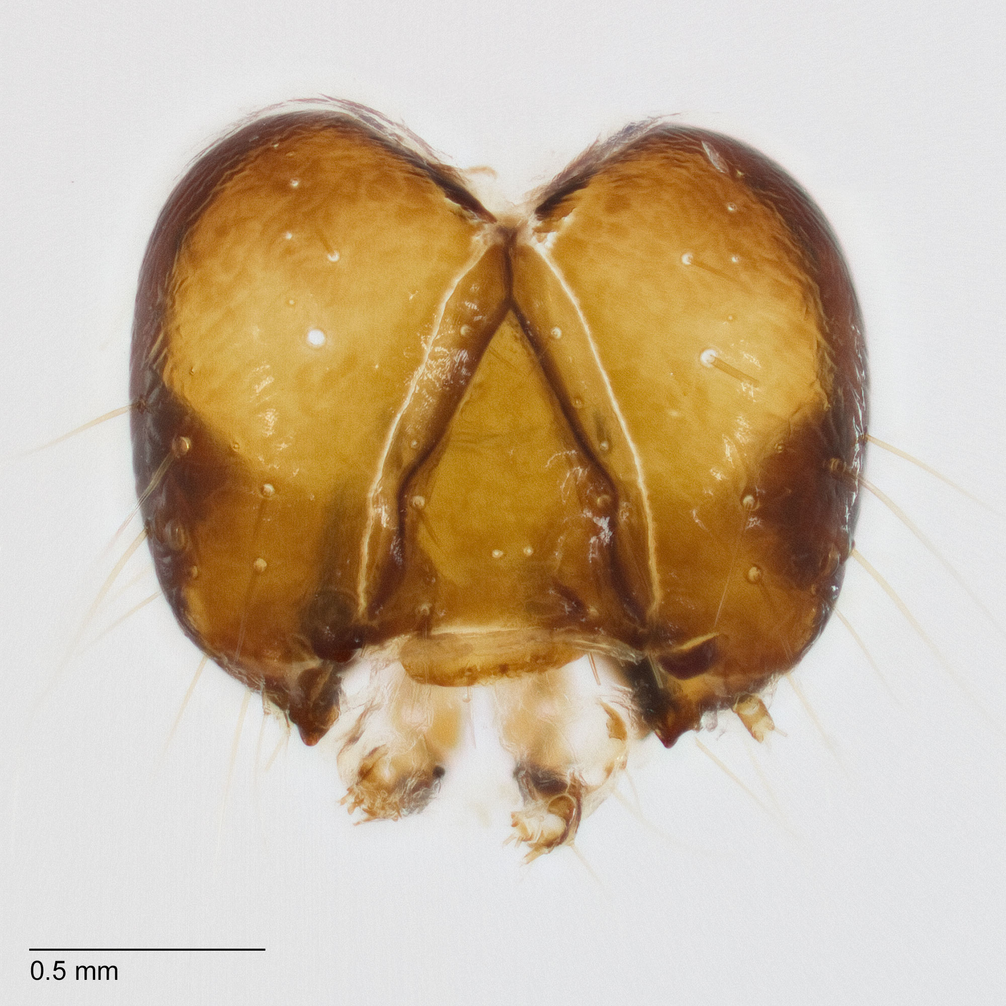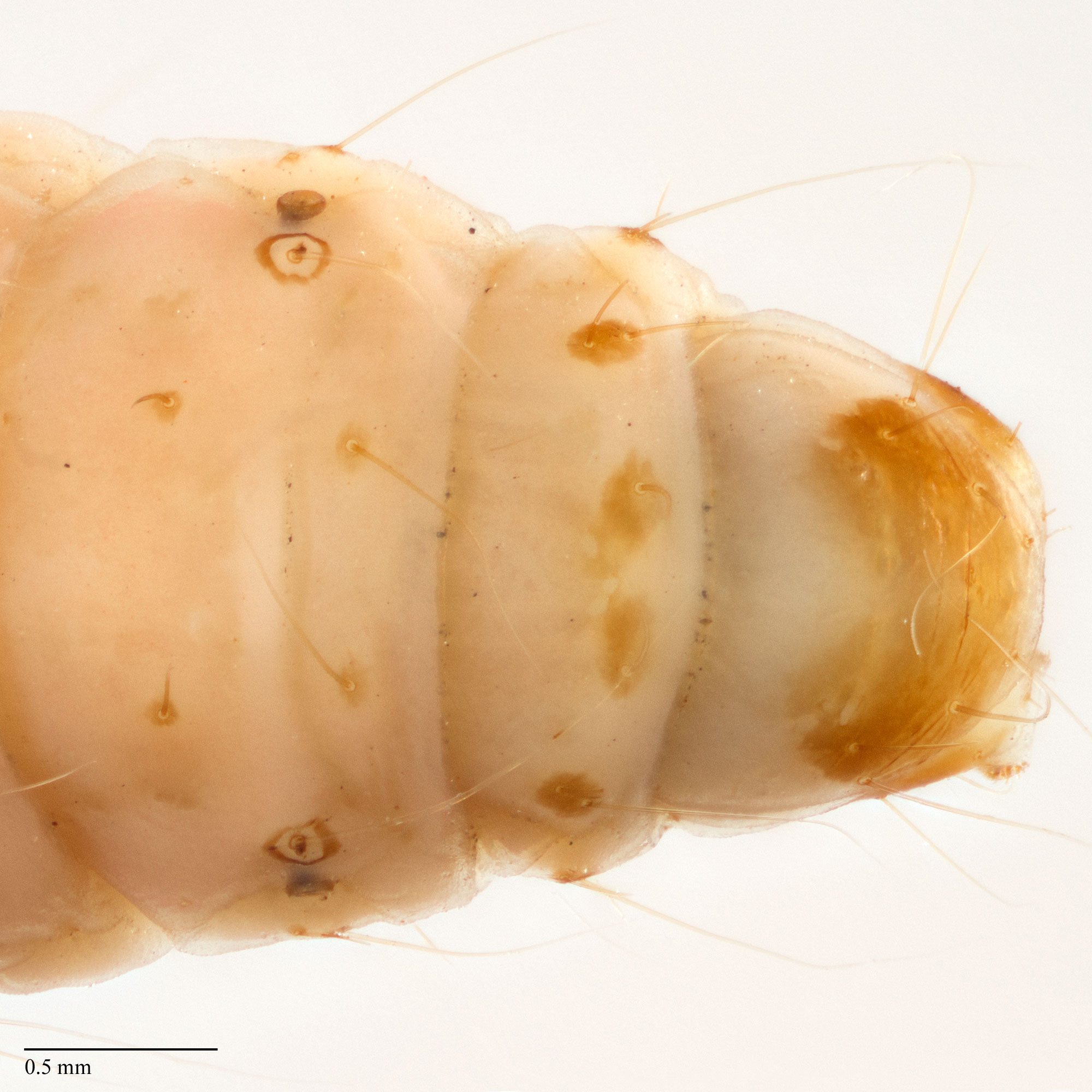 ring around SD1 of A8 is usually incomplete, SD2 is separated from the spiracle of A8 by less than two times the spiracle's diameter, and the anal shieldanal shield: