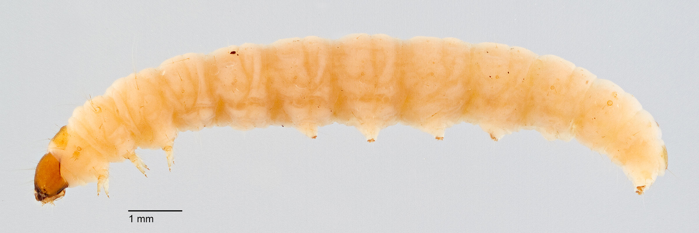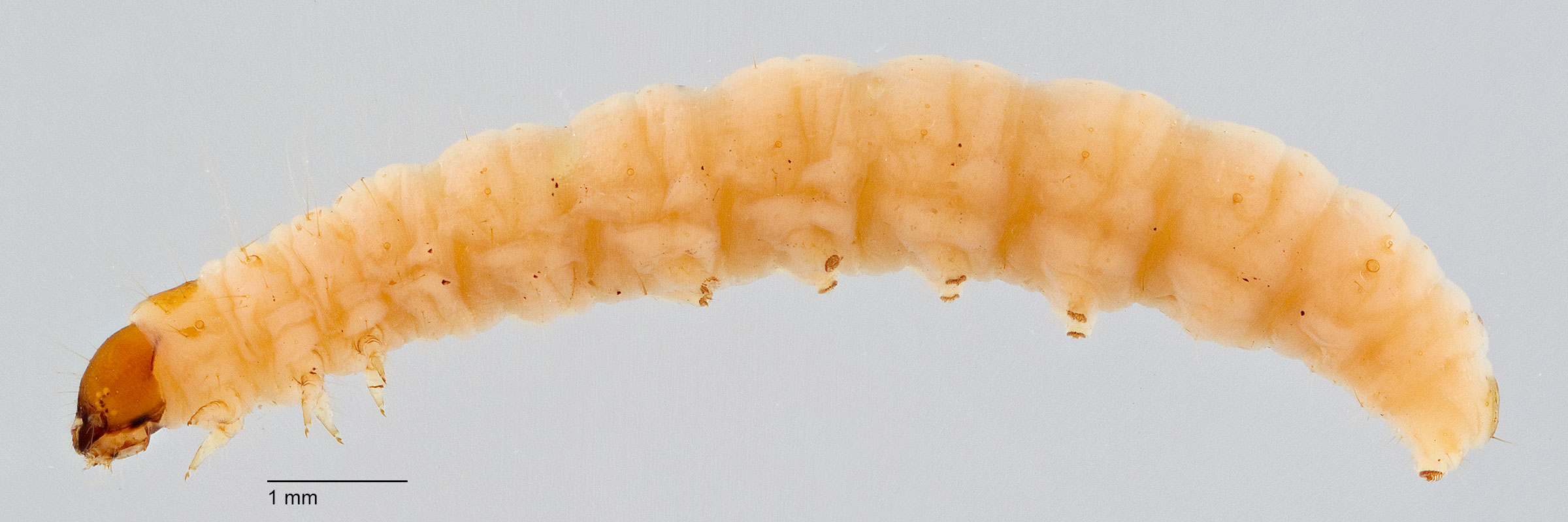 is associated with stored products from a building or at least is from dried fruits, nuts, or similar substrate. Larvaelarva: