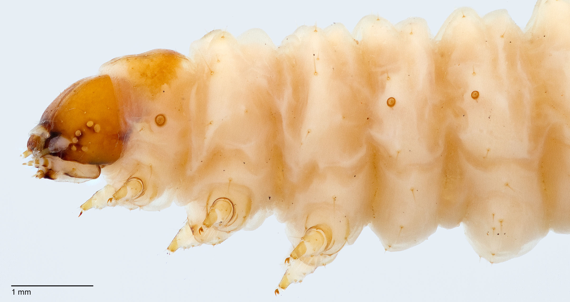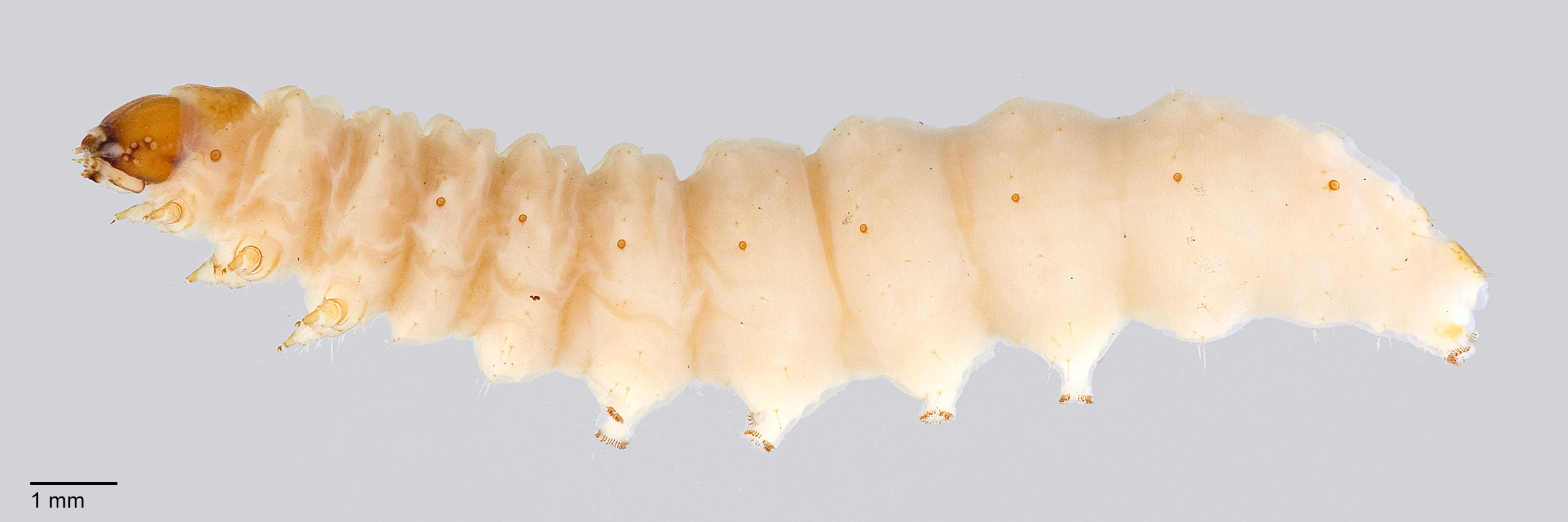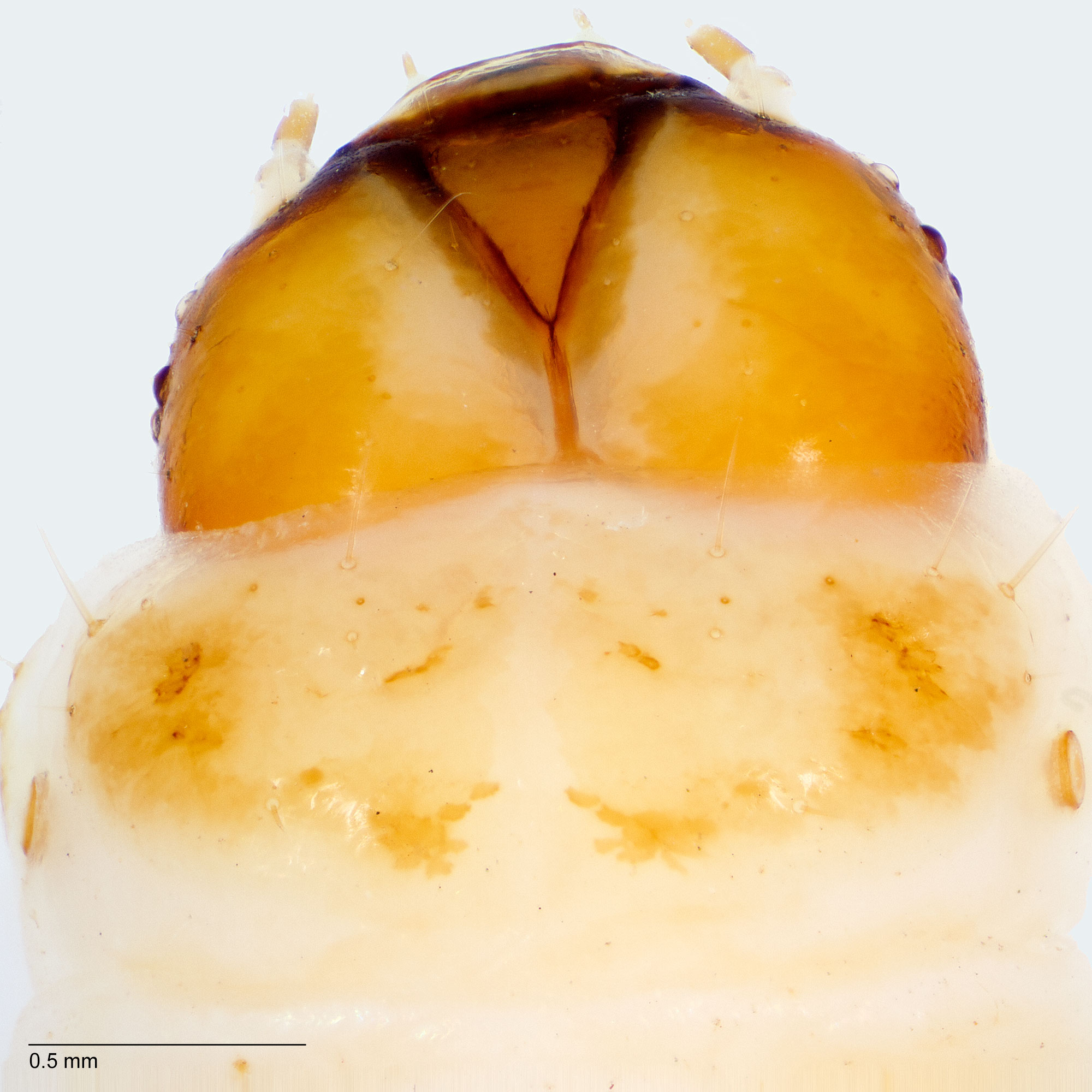 Weisman, D. M. 1986. Keys for the identification of some frequently intercepted lepidopterous larvae. U.S. Department of Agriculture, Animal and Plant Health Inspection Service, Plant Protection and Quarantine series 81-47. 64 pp. used the presence of a dark spot on the anterioranterior: