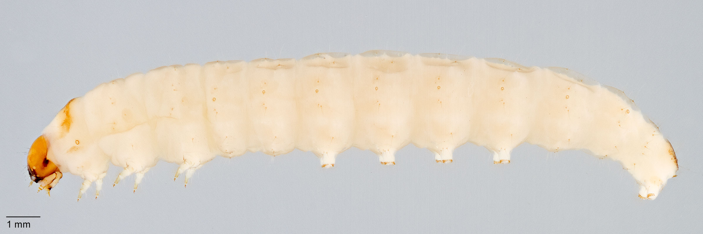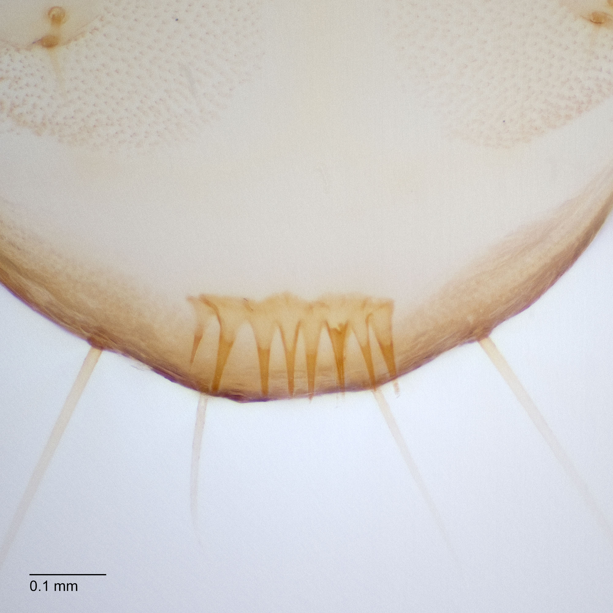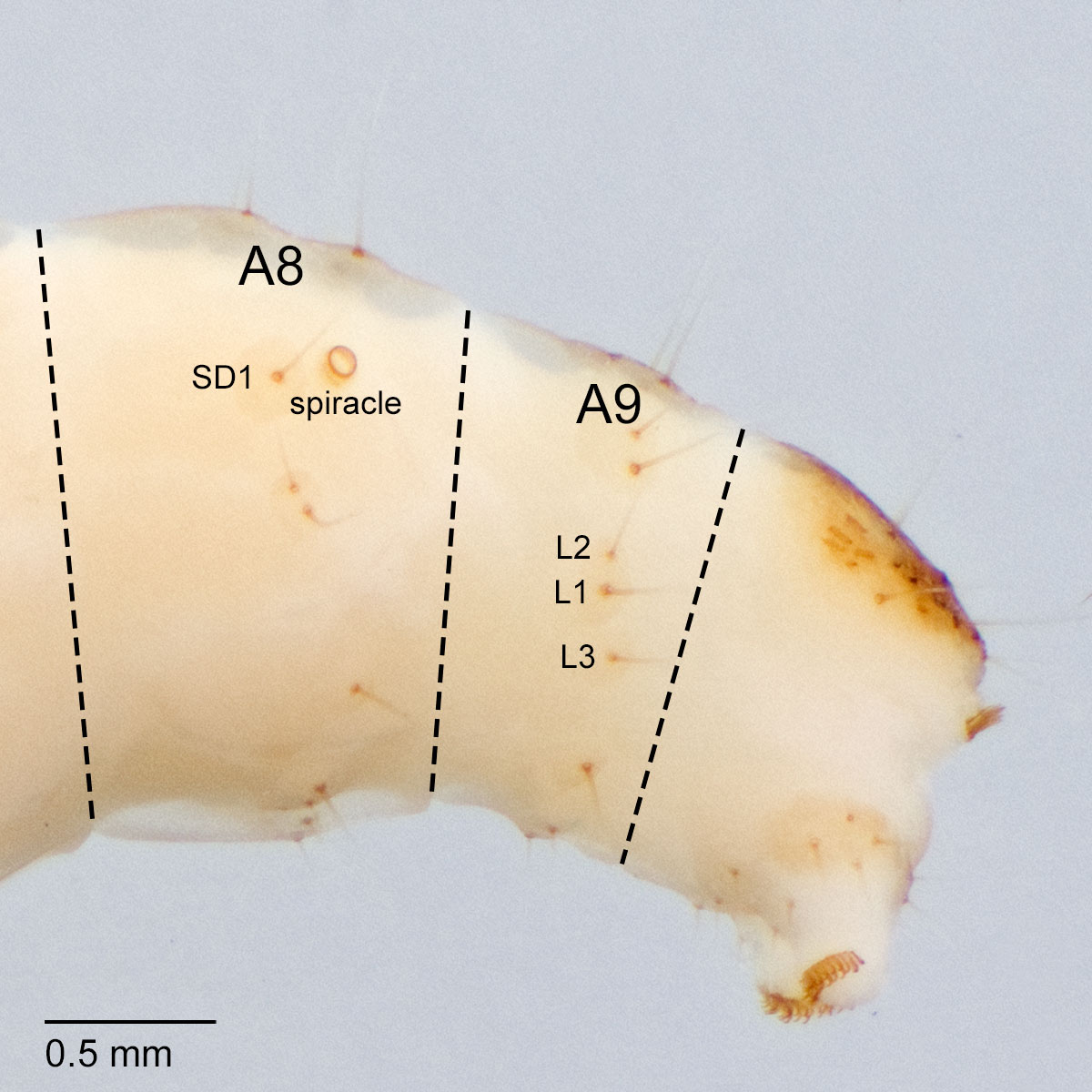present with 2-10 teeth. Other larval characters include: SD2 on A1-8 highly reduced or appearing absent; SV counts 3:3:2:2:1; spiracle on A8 displaced posteradposterad: