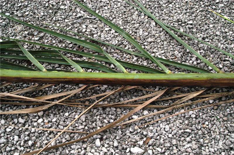 Figure 2. Close-up of Phoenix canariensis leaf with one side exhibiting necrotic leaflets and a brown stripe on the petiole and rachis due to Fusarium wilt. Photo by M. L. Elliott.