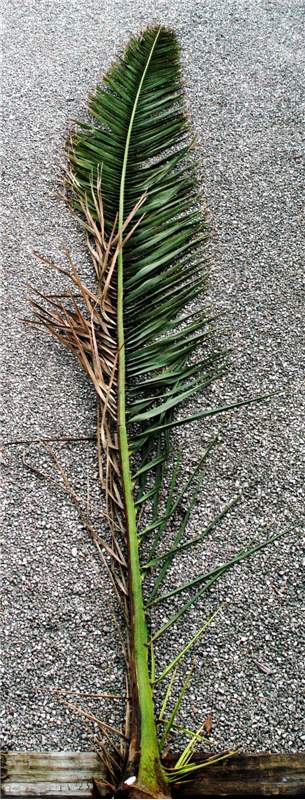 Figure 1. A Phoenix canariensis leaf with one side exhibiting necrotic leaflets and a brown stripe on the petiole and rachis due to Fusarium wilt. Photo by M. L. Elliott.