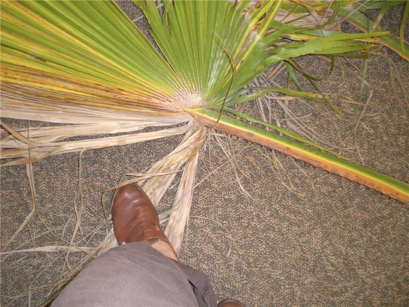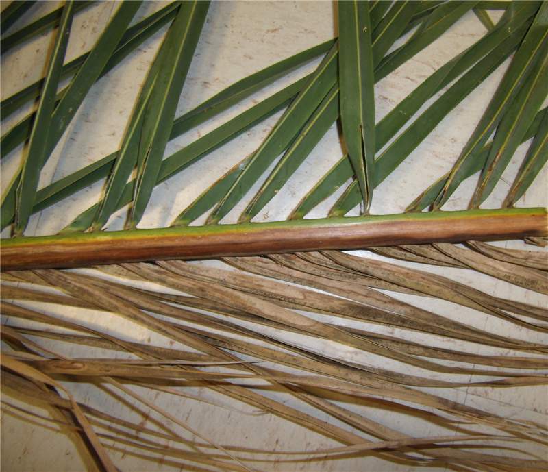 Figure 1. Initial symptoms on Syagrus romanzoffiana. Only a few leaflets on one side of the rachis have died. Note the reddish-brown stripe on the rachis. Photo by M. L. Elliott.