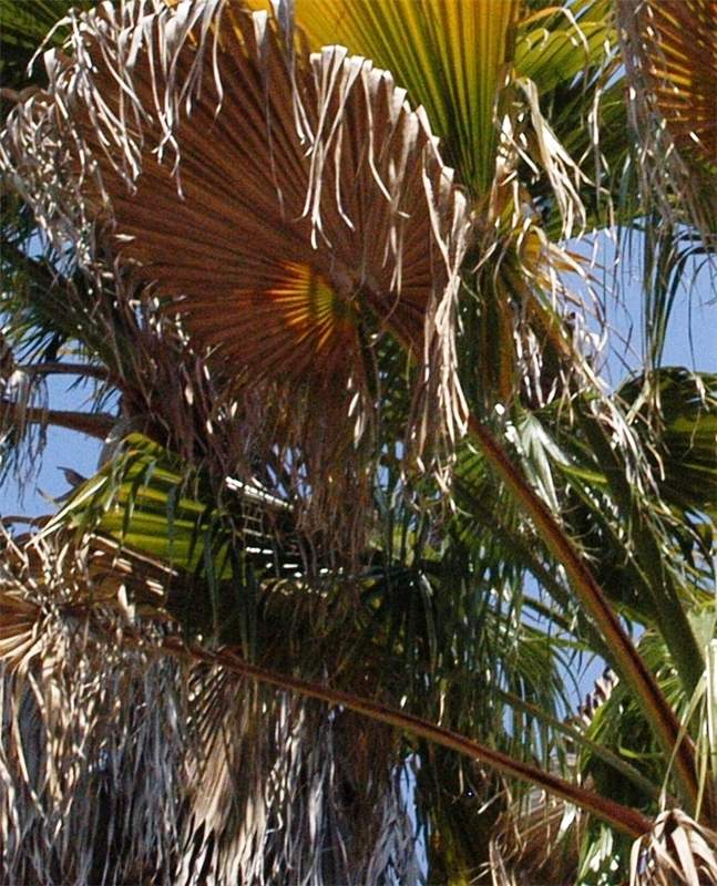 Figure 4. These dying Washingtonia robusta leaves have a brown stripe on the petiole due to Fusarium wilt. Photo by M. L. Elliott.