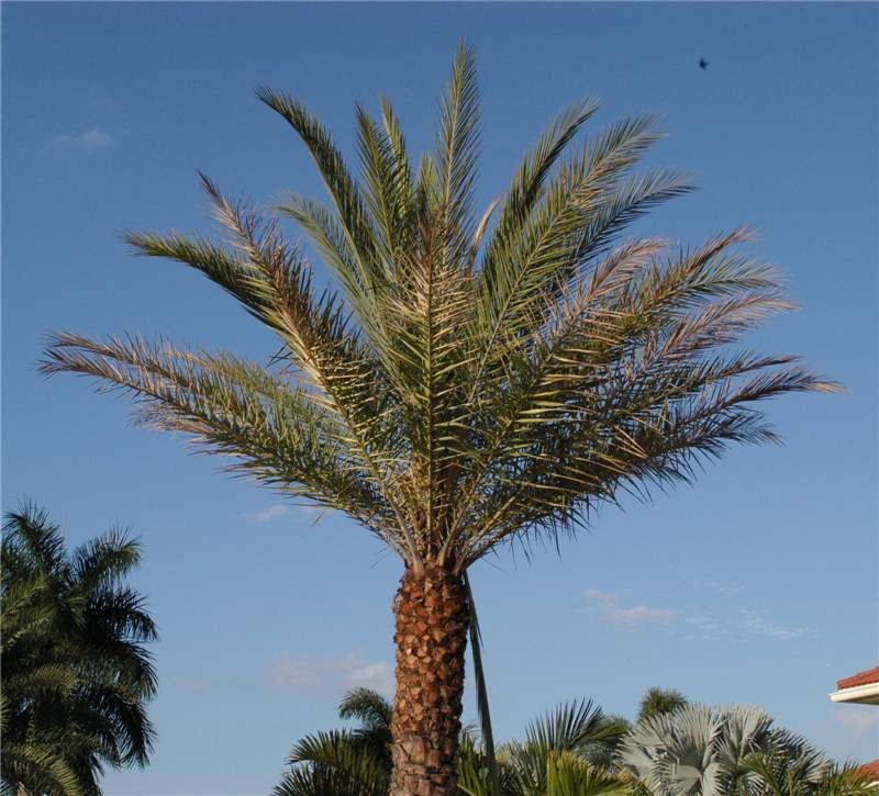 Figure 6. Spear leaf of this Phoenix sylvestris has collapsed and is hanging down out of the canopy on the right side of the trunk. Very few of the oldest leaves have discolored. Photo by M. L. Elliott.