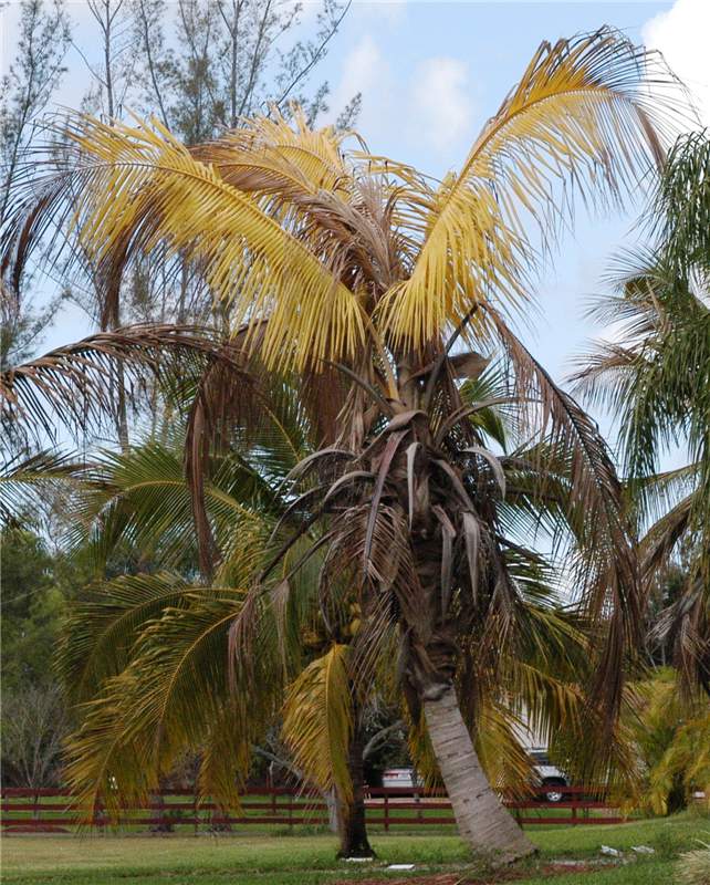 The next symptom observed is foliar discoloration. This symptom varies markedly among Cocos nucifera cultivars and other palm genera. For most tall-type coconut cultivars, leaves turn a golden yellow before dying (Figs. 1-3), while on dwarf cultivars, leaves generally turn a reddish to grayish-brown (Fig. 4). Affected leaves of the green form of the 'Malayan Dwarf' coconut cultivar appear noticeably flaccid rather than turgid, giving an overall wilted appearance to the palm canopycanopy: