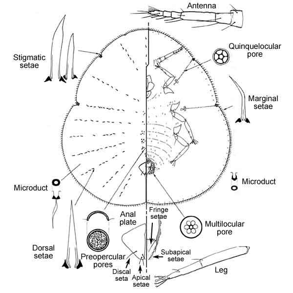 Without submarginal tubercles; dorsal setae conical arranged in lines; without tubular ducts; marginal setae simple with acute apices; anal plates with conspicuous discal seta; without tibio-tarsal articulation or sclerosis. Other characters: Each anal plate with 3 apical setae and no subdiscal seta; with 6 to 8 subapical setae on each plate; anal fold with 2 or 4 fringe setae; 1 pair of prevulvar setae (often obscured by anal plates); multilocular pores normally with 6 to 8 loculi; multiloculars present in vulvar area only; multilocular pores anterior of anterior spiracle predominantly with 5 loculi, about same size as pores laterad of anterior spiracle; claw with small denticle; claw digitules equal; tibia and tarsus partially fused; stigmatic setae differentiated from other marginal setae, middle seta longer than lateral setae; anal plates with posterior margin about equal to length of anterior margin; antennae usually 6-segmented; preopercular pores conspicuous, present in longitudinal line from mesothorax to anal area.