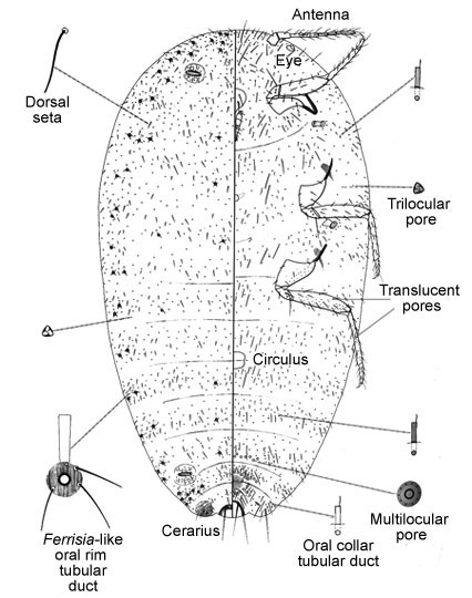 Body elongate oval; body dark gray; legs dark brown; covered by white mealy wax, with 2 submedial longitudinal bare areas on dorsum; dorsal ovisac absent, a few filamentous strands on venter, forming a pad; with 1 pair of conspicuous lateral wax filaments, about 1/2 as long as body. Occurring on all parts of plant, usually in protected area. Usually ovoviviparous. With numerous thin crystalline rods protruding from dorsum.