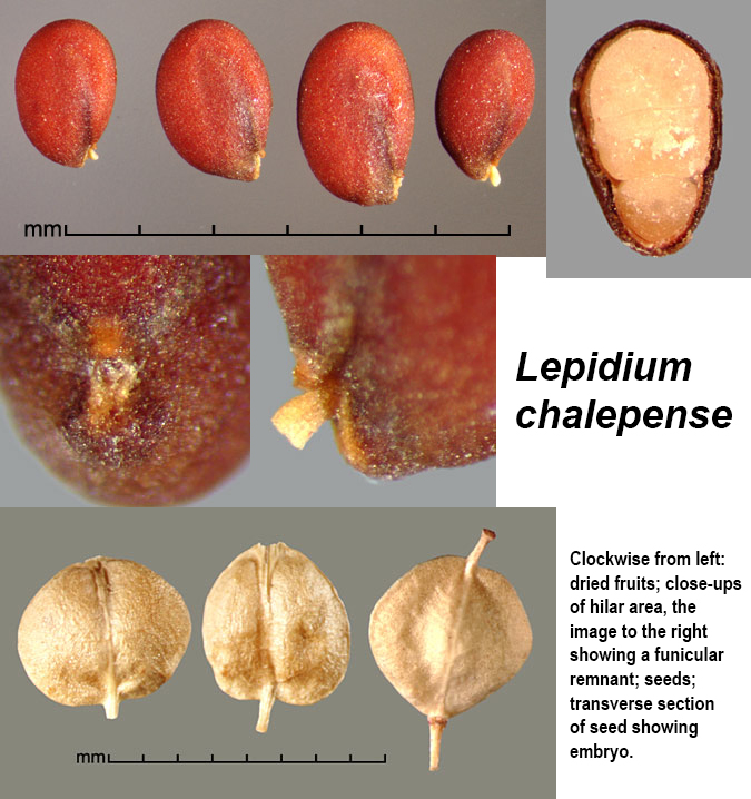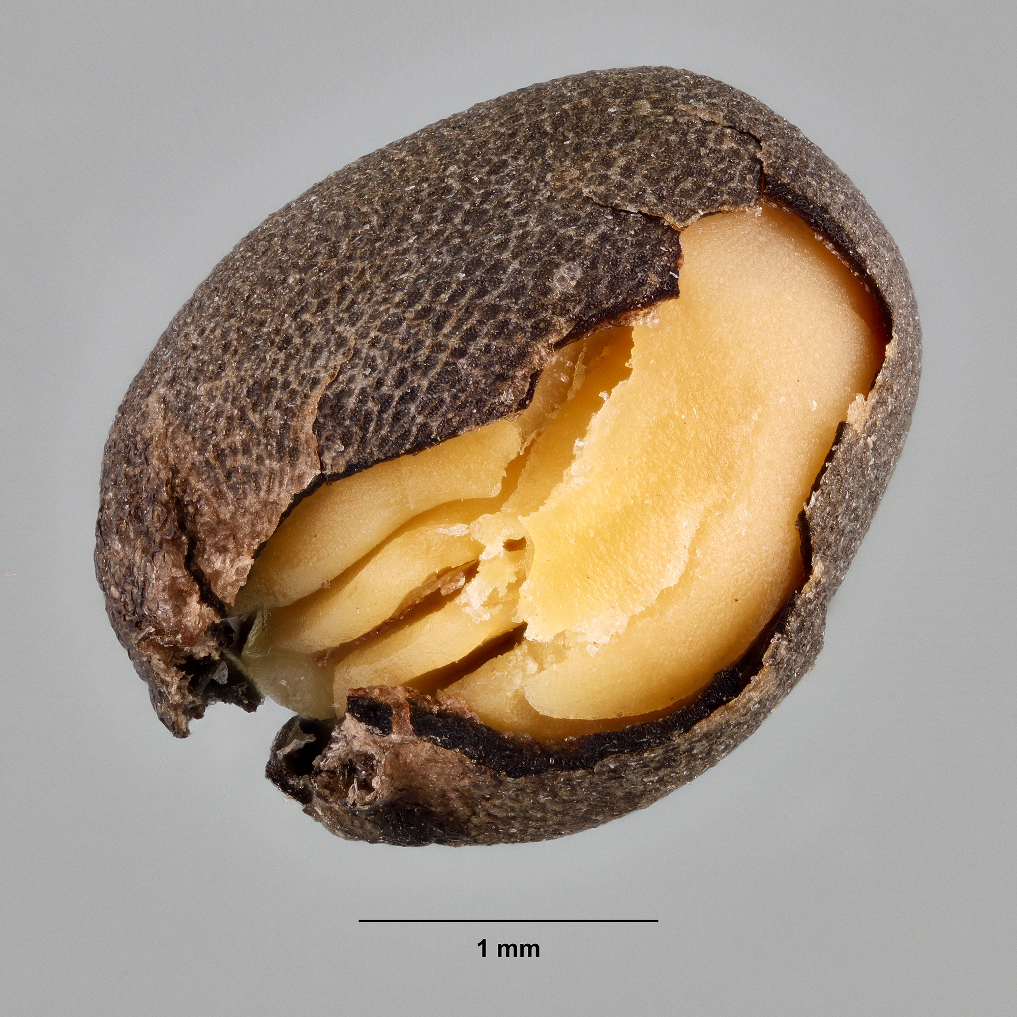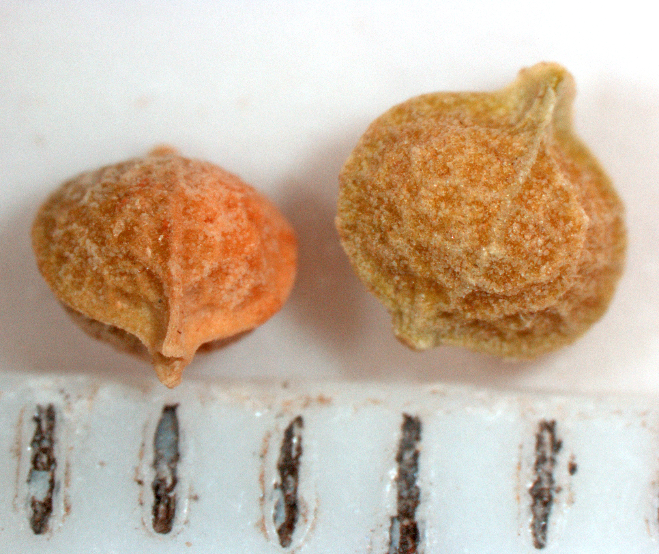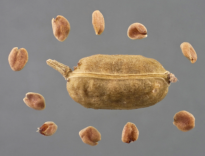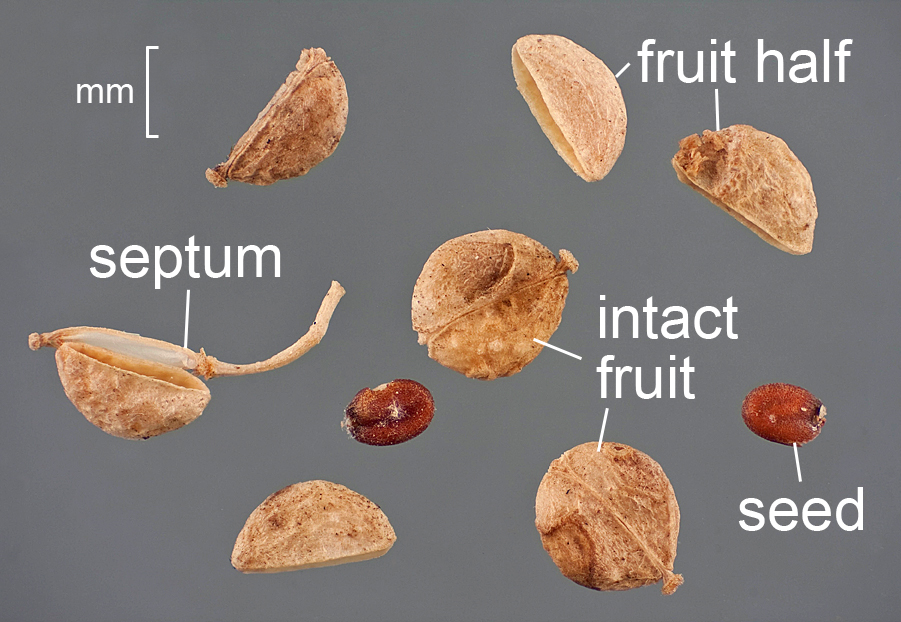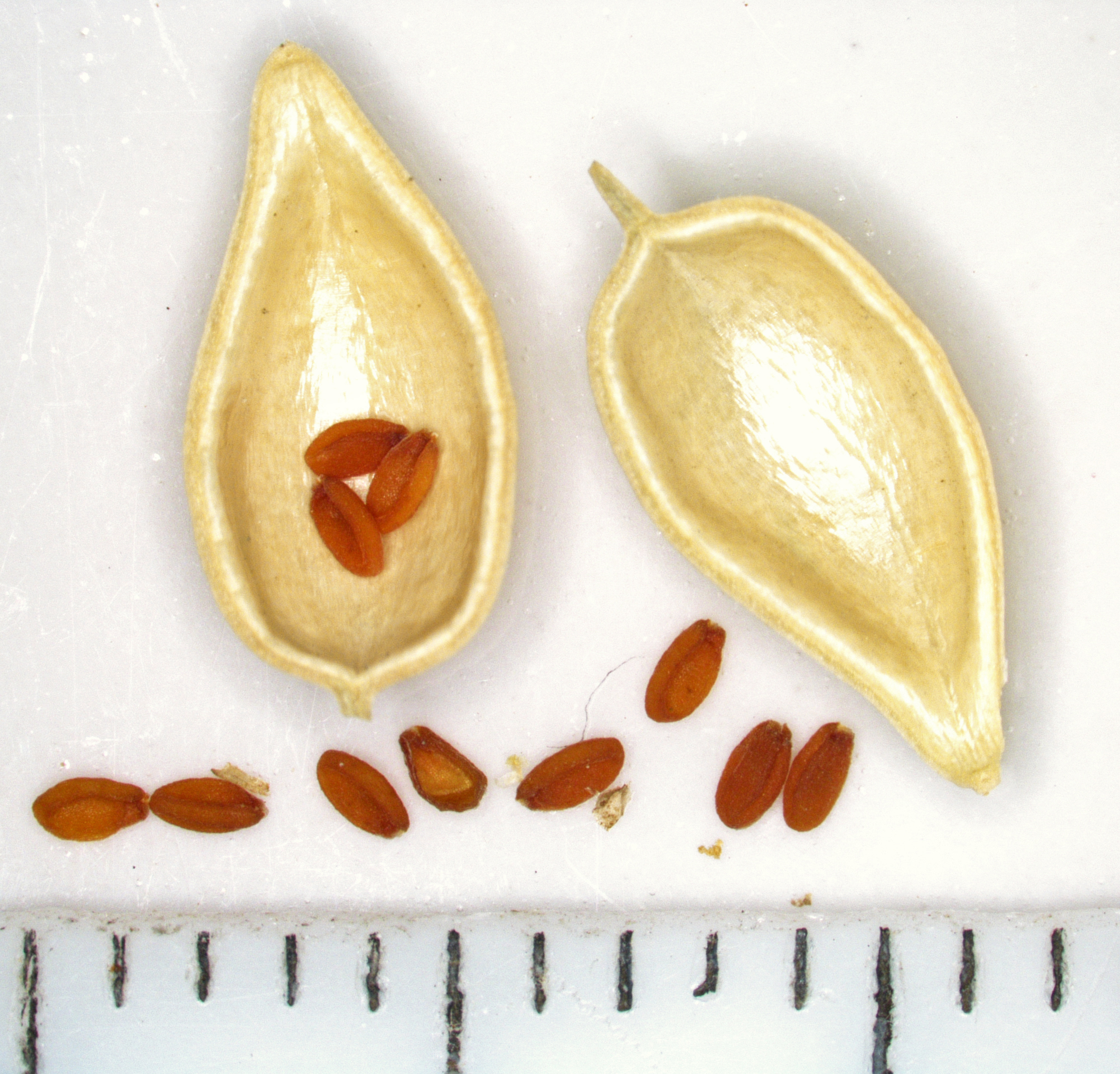 | Unique features | Small seeds of two types, globoseglobose: 3D shape—more or less spherical with minutely reticulatereticulate:surface relief—netted, raised walls or concave grooves forming a net-like surface pattern with flat, concave, or convex interspaces , pittedpitted:surface relief—surface with small depressions in which the areas between the hollows do not take on the appearance of a true reticular net , wartywarty:surface relief—distinct, rounded projections that are large relative to the fruit size; tuberculate, verrucose or wrinkledwrinkled:surface relief—shallow, irregular folds and furrows covering the surface; appearing overall though crumpled and then spread out seed coat or flattened and orbicularorbicular:2D shape—circular in outline, 3D shape—globose to lanceolatelanceolate:2D shape—lance-shaped; much longer than wide, with widest point below the middle, tapering to the apex (compare oblanceolate) in outline, pittedpitted:surface relief—surface with small depressions in which the areas between the hollows do not take on the appearance of a true reticular net or rough seed coat, often winged, with a notched or cleft margin, and with groove or line between outwardly visible cotyledoncotyledon:a primary leaf of the embryo and radicleradicle:the embryonic root of the embryo . Seeds with curvedcurved:(of embryo) linear embryo is curved into an arch or horseshoe with the ends far apart or folded embryos filling the seed coat, visible in the flattened seed type. Seed coat often mucilaginousmucilaginous:resembling mucilage; moist and sticky when wetted. |