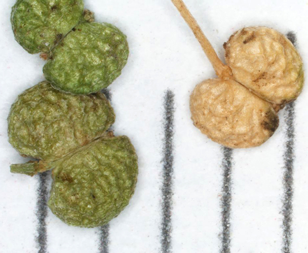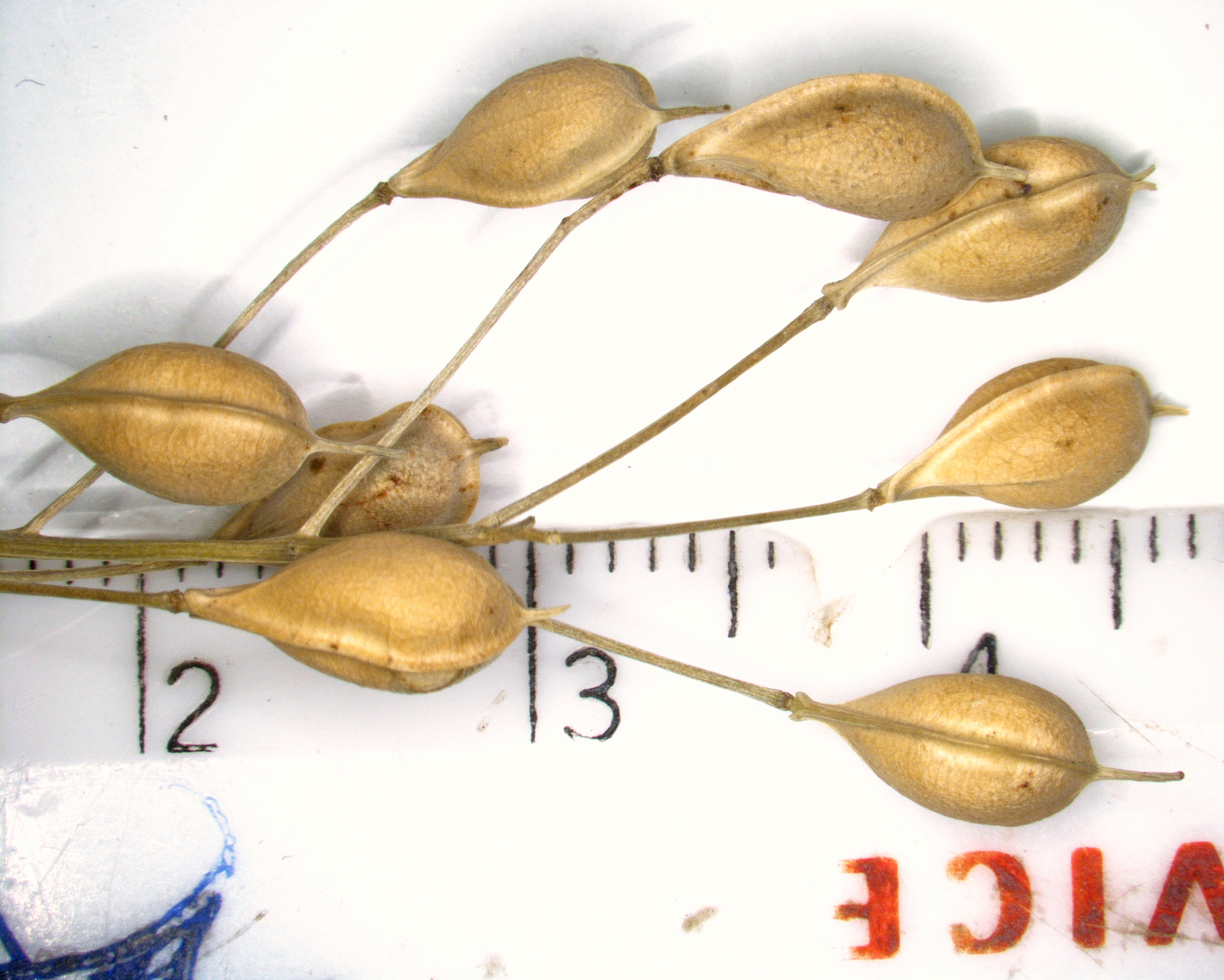 | Type | bivalved capsulecapsule: a dry, dehiscent fruit derived from a compound ovary (siliquesilique:(includes silicle) a fruit derived from a 2-loculed, single, superior compound ovary in which the two halves of the fruit split away from a persistent partition (around the rim of which the seeds are attached) or siliclesilique:(includes silicle) a fruit derived from a 2-loculed, single, superior compound ovary in which the two halves of the fruit split away from a persistent partition (around the rim of which the seeds are attached) ), nutlike, schizocarpschizocarp:usually dry fruit splitting between two or more locules to form distinct, indehiscent, usually one seeded segments; fruit derived from a single, superior or inferior, compound ovary; compare to mericarp (e.g. Raphanus), samaralike |