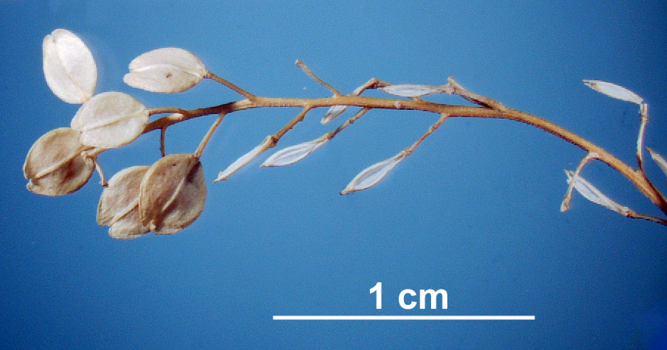| Unique features | Usually bivalved capsulescapsule: a dry, dehiscent fruit derived from a compound ovary , opening longitudinally from the base to apexapex:the point farthest from the point of attachment, or the "tip" of an organ , with few to many seeds attached to the persistent rim or replumreplum:the rim, formed by the persistent placentas, and connected by a false septum in Brassicaceae fruits. The fruit valves are attached to this rim and separate from it in dehiscent fruits. , and divided by a paperypapery: texture—papyraceous, chartaceous; very thin, pliable, and readily torn; like paper or membranousmembranous: texture—extremely thin, pliable, and fairly tough partition. Often with persistent stylestyle: in a flower, the narrow and elongated part of the pistil between the stigma and the ovary; sometimes persisting in fruit remnant and/or beakedbeak:a usually firm, terminal appendage, sometimes tapered . |