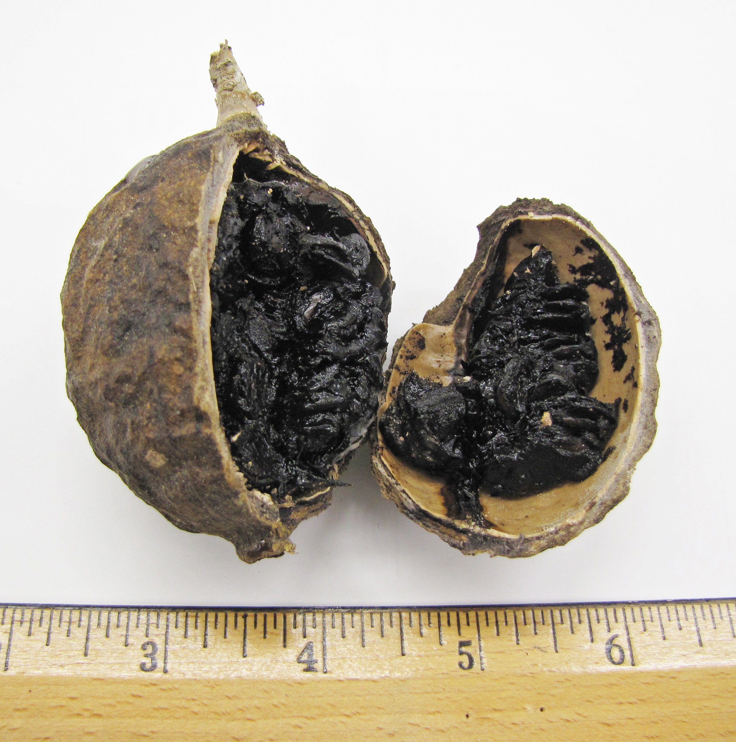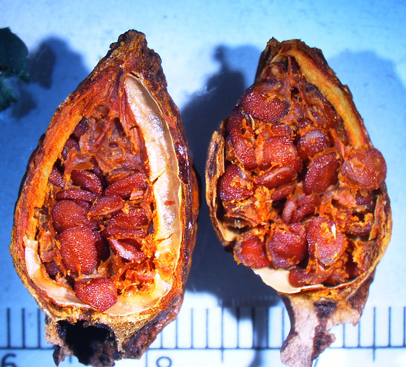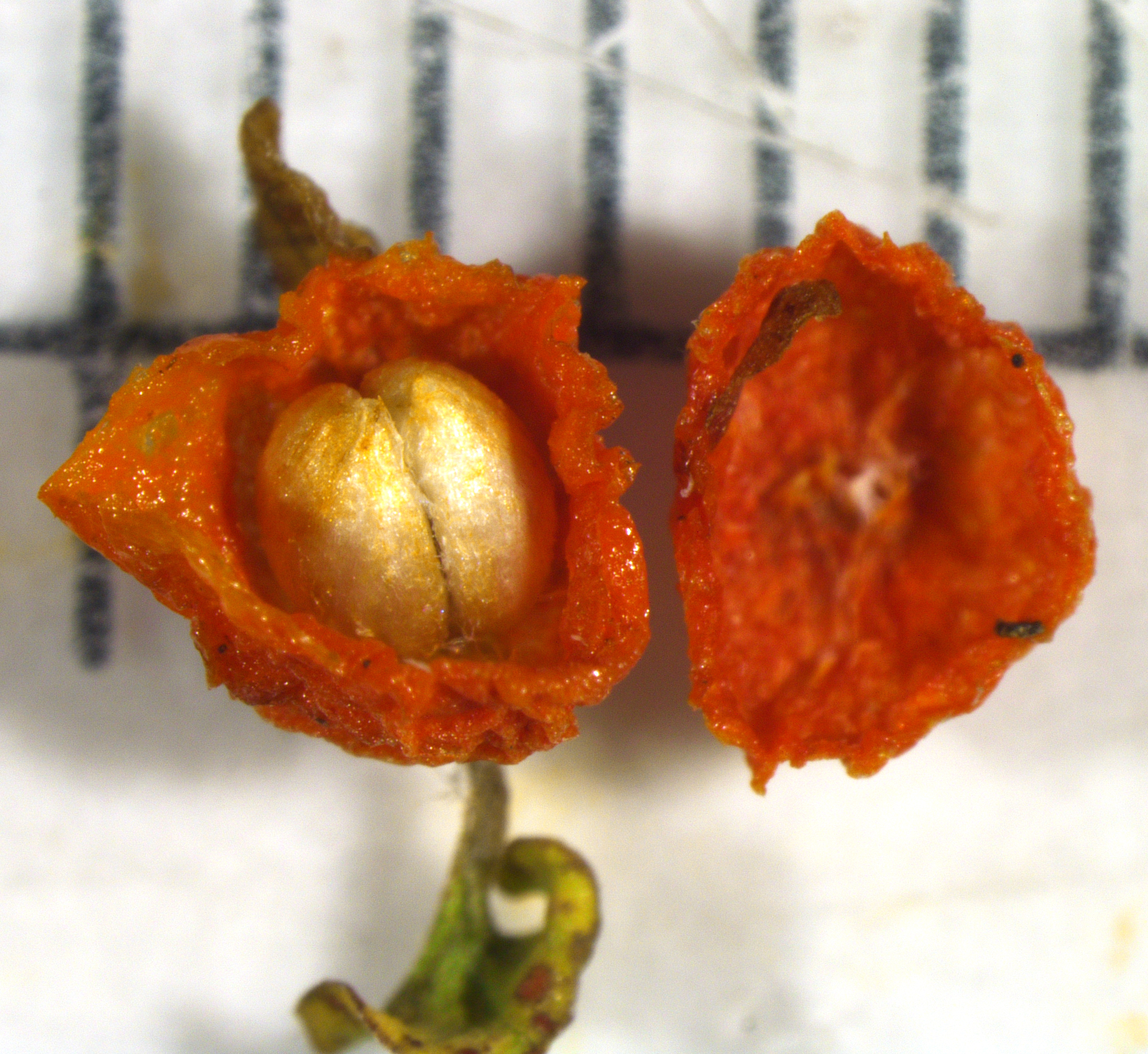 | Type | capsulecapsule: a dry, dehiscent fruit derived from a compound ovary , drupedrupe:(indehiscent drupe) a fleshy, indehiscent fruit with one more hard pits enclosing seeds, derived from single, superior, simple or compound ovary; (dehiscent drupe) a fruit with a dry or fibrous to fleshy or leathery outer husk that early to tardily breaks apart (or opens), exposing one or more nutlike pits enclosing the seeds , berryberry:an indehiscent, fleshy fruit with one or a few to many seeds. The flesh may be homogenous throughout. Or, if the outer part is hard, firm, or leathery, referred to as an hesperidium. Septa are present in some, and the seeds may be arillate or with a fleshy testa. , schizocarpschizocarp:usually dry fruit splitting between two or more locules to form distinct, indehiscent, usually one seeded segments; fruit derived from a single, superior or inferior, compound ovary; compare to mericarp splitting into 2 indehiscentindehiscent:not opening on its own, as in a fruit or dehiscentdehiscent:(v. dehisce) splitting open at maturity to release contents (of a fruit) mericarps, rarely samarasamara:a winged, indehiscent, dry fruit containing a single (rarely two) seed(s) or aggregateaggregate:fruit formed from a single flower with carpels several and distinct of achenesachene:a dry, indehiscent, one-seeded fruit, with seed attached to pericarp at a single point, derived from a single, superior, simple or compound, one-loculed ovary or drupeletsdrupelet:one drupe of a fruit with multiple drupes, as in blackberries |